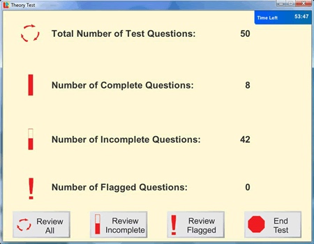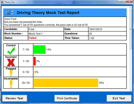 • 14 properly balanced pre-set simulated Theory Tests based on our extensive experience (as one of the largest national driving schools in the UK) of the most commonly occurring test questions all under realistic exam conditions.